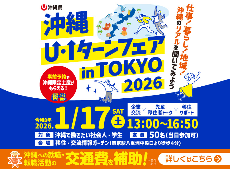 地元へ帰って働きたい方(Uターン)県外から新しく移住して働きたい方(Iターン)など沖縄で働きたい方のお仕事探しを支援しています。