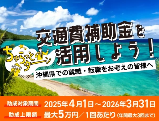 沖縄県では県外から県内での就職・転職を目指す方に向けて、交通費や宿泊費の50%を補助する制度を実施中!最大5万円の補助を活用できるから、お財布にやさしい就活ができるのがポイントです!